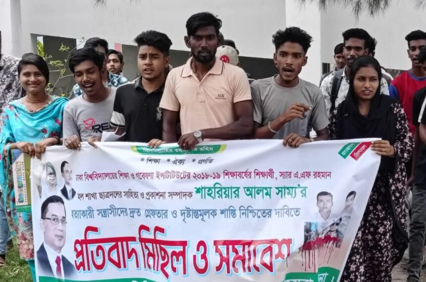 ঢাকা বিশ্ববিদ্যালয়ের স্যার এ এফ রহমান হল শাখা ছাত্রদলের সাহিত্য ও প্রকাশনা বিষয়ক সম্পাদক শাহরিয়ার আলম সাম্যকে হত্যার প্রতিবাদে খুলনার কয়রায় বিক্ষোভ মিছিল ও প্রতিবাদ সমাবেশ করেছেন স্থানীয় ছাত্রদলের নেতাকর্মীরা।