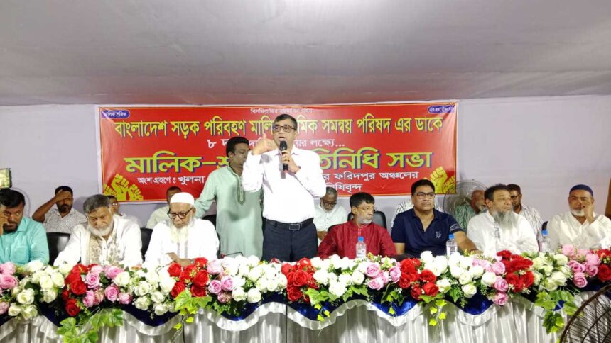 বাংলাদেশ সড়ক পরিবহন মালিক-শ্রমিক ঐক্য পরিষদের খুলনা বিভাগীয় সভাপতি আনিসুর রহমান লিটনের সভাপতিত্বে অনুষ্ঠিত সভায় বক্তব্য দেন পরিবহন শ্রমিক ফেডারেশনের কেন্দ্রীয় সভাপতি আব্দুর রহিম বক্স দুদু ও বরিশাল বিভাগের সাধারণ সম্পাদক ইউসুফ আলী প্রমুখ।