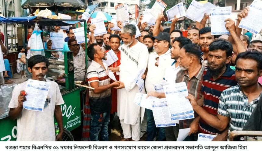 বগুড়া সদর উপজেলা প্রজন্মদল আহ্বায়ক রাসেল শেখের ব্যবস্থাপনায় ও সদস্য সচিব রেজাউল সরকার রেজার নেতৃত্বে নেতাকর্মীরা ধানের শীষের স্লোগান দেন। রেলওয়ে ট্রাস্ট মার্কেট থেকে সাতমাথা পর্যন্ত লিফলেট বিতরণ করা হয়।