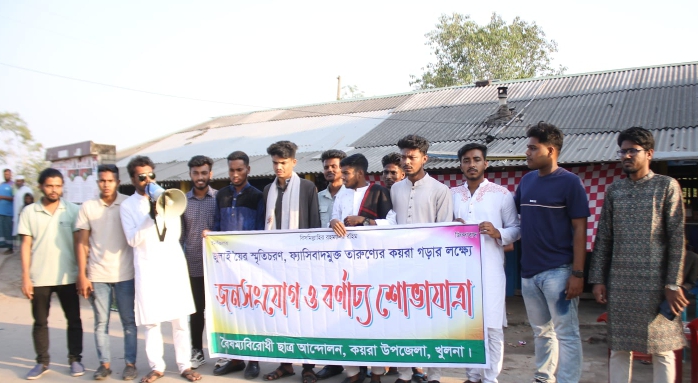 বৈষম্যবিরোধী ছাত্র আন্দোলনের উদ্যোগে কয়রা উপজেলায় বর্ণাঢ্য শোভাযাত্রা ও জনসংযোগ অনুষ্ঠিত হয়েছে। সংগঠনের নেতারা জানিয়েছেন, এই কর্মসূচির মূল লক্ষ্য ছিল তরুণদের মধ্যে বৈষম্যবিরোধী চেতনা ছড়িয়ে দেওয়া এবং ফ্যাসিবাদমুক্ত ভবিষ্যৎ গড়ার শপথ নেওয়া।