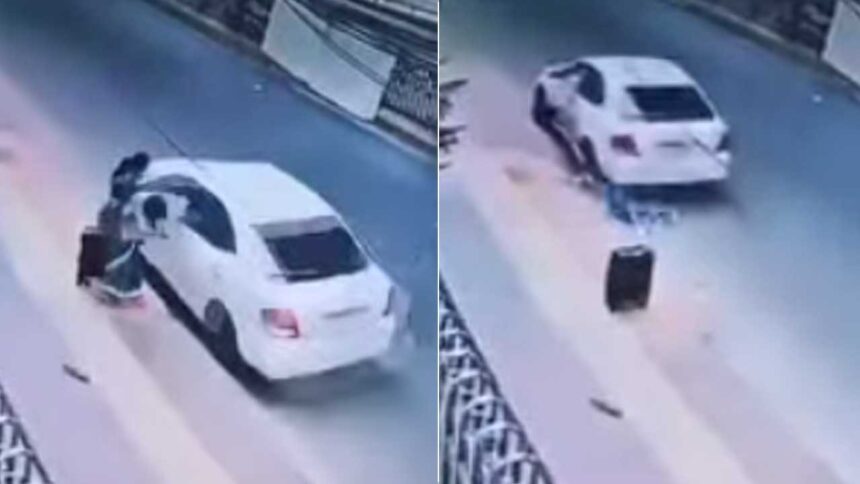 ভিডিওটিতে দেখা গেছে, সামনে আসার এক-দুই সেকেন্ডের মধ্যে ভেতর থেকে একজন ভ্যানিটি ব্যাগটি টান দেয়। ওই নারীকেও গাড়ির সঙ্গে টেনে নিয়ে যেতে দেখা যায়। এ সময় ট্রলি ব্যাগটি ঘটনাস্থলে থেকে যায়। পরে আশপাশে থাকা তিন ব্যক্তিকে দৌড়ে ঘটনাস্থলে আসতে দেখা যায়। এর মধ্যে একজন ট্রলি ব্যাগটির সামনে দাঁড়ান। বাকি দুজন ওই নারীর দিকে এগিয়ে যান। ৫০ সেকেন্ডের মাথায় ওই নারীকে আবার ঘটনাস্থলে এসে দাঁড়িয়ে উপস্থিত চার ব্যক্তির সঙ্গে কথা বলতে দেখা যায়। এ সময় ভুক্তভোগী নারী অন্যদেরকে হাতের কনুইয়ে আঘাতের চিহ্ন দেখাচ্ছিলেন।
