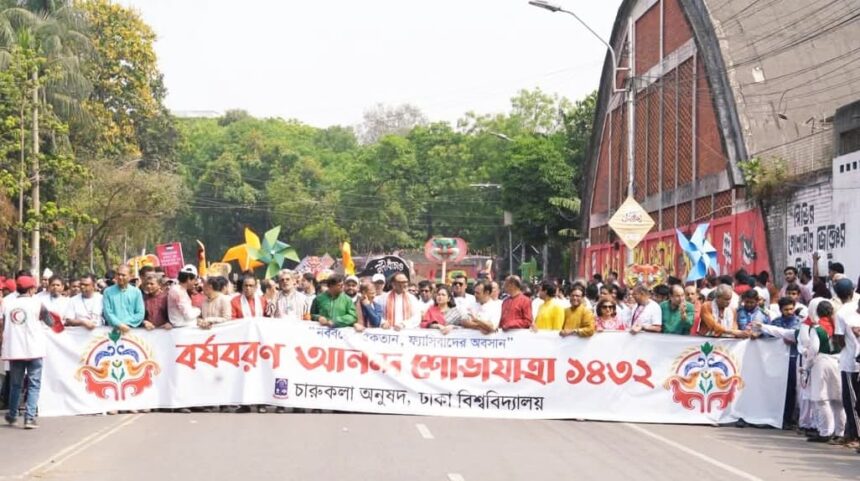 অনিক খাঁন, ঢাকা: বাংলা নববর্ষ-১৪৩২ কে স্বাগত জানিয়ে উৎসবমুখর পরিবেশে ও নির্বিঘ্নে শেষ হলো ‘বর্ষবরণ আনন্দ শোভাযাত্রা’। এবারের প্রতিপাদ্য ছিলো—‘নববর্ষের ঐকতান, ফ্যাসিবাদের অবসান’। শোভাযাত্রাকে কেন্দ্র করে ছিল ঢাকা মেট্রোপলিটন পুলিশ এর নিশ্ছিদ্র নিরাপত্তা ব্যবস্থা।