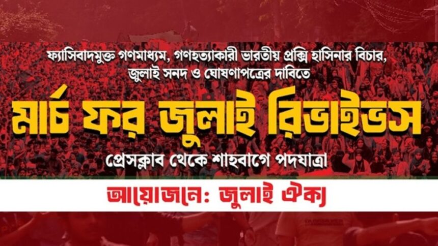 ফ্যাসিবাদমুক্ত গণমাধ্যম, গণহত্যাকারী ভারতীয় প্রক্সি হাসিনার বিচার, জুলাই সনদ ও ঘোষণাপত্রের দাবিতে ‘মার্চ ফর জুলাই রিভাইভস’ প্রেসক্লাব থেকে শাহবাগে পদযাত্রা কর্মসূচি পালন করবে গণ-অভ্যুত্থানের স্প্রিট ধারণকরা ঐক্যবদ্ধ প্লাটফর্ম জুলাই ঐক্য।
