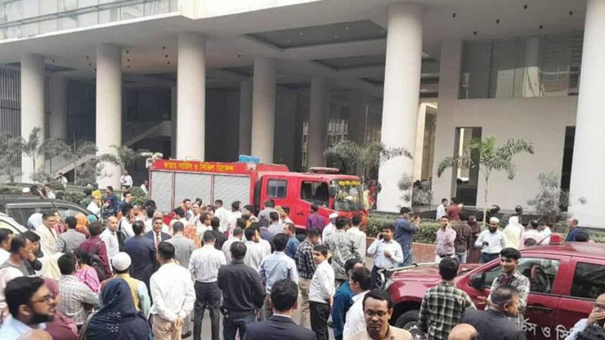 বাংলাদেশ সচিবালয়ের নতুন ভবন (১ নম্বর ভবন) থেকে ধোঁয়া ওঠার একটি ঘটনা আতঙ্ক সৃষ্টি করেছে। ধোঁয়া দেখা দেওয়ার পর ভবনজুড়ে বারবার ফায়ার সাইরেন বেজে ওঠে। এ সময় ভয়ে অনেক কর্মকর্তা–কর্মচারী দ্রুত ভবন ত্যাগ করেন। তবে কী কারণে ধোঁয়া উঠেছে—তাৎক্ষণিকভাবে কেউ নিশ্চিত করতে পারেননি।