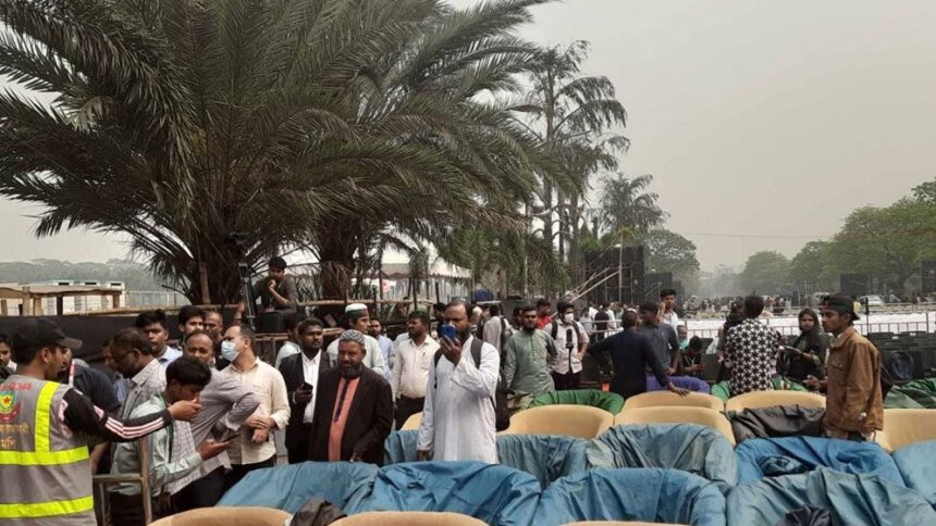 সকালের পর থেকেই সংসদ ভবন সংলগ্ন সড়ক ও ফুটপাতে ব্যাপক প্রস্তুতি চলছিল। মঞ্চের পাশে ওয়াশরুম, পুলিশ বুথ, পানির ব্যবস্থা ও নারীদের জন্য আলাদা বুথ তৈরি করা হয়েছে।